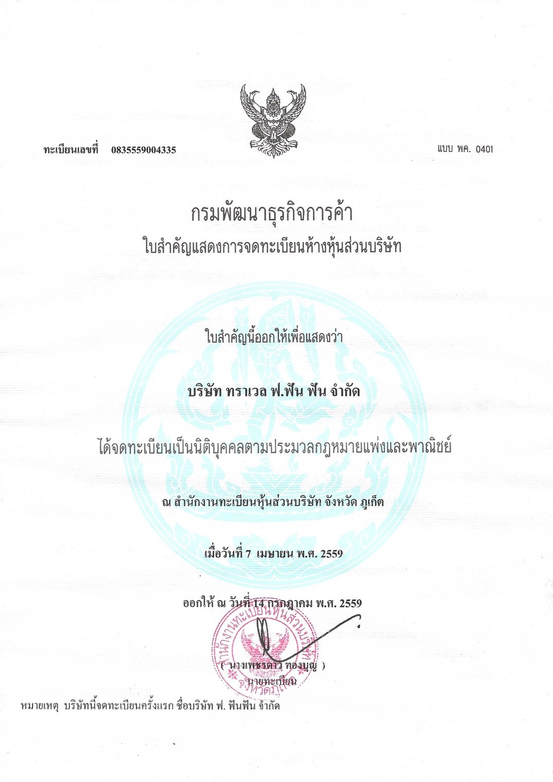ทราเวล ฟ.ฟัน ฟัน ได้จดทะเบียนในรูปแบบบริษัทจำกัด ภายใต้ชื่อ บริษัท ทราเวล ฟ.ฟัน ฟัน จำกัด ด้วยทุนจดทะเบียน 1 ล้านบาท ใบอนุญาติประกอบธุรกิจนำเที่ยวเลขที่ 32/01237