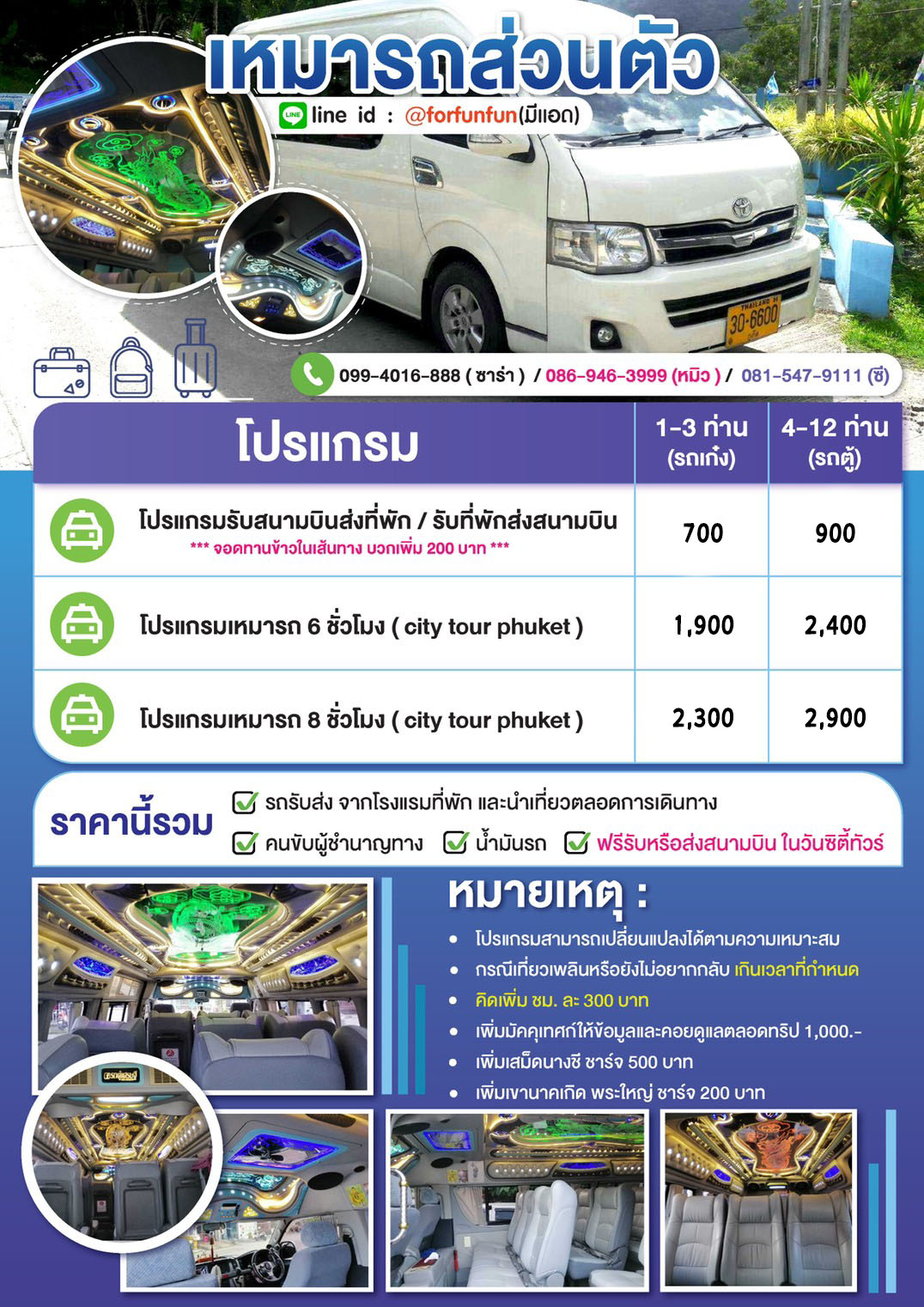 บริการรถตู้ VIP ภูเก็ตพังงากระบี่ ด้วยทีมงานชำนานทางที่มีประสบการณ์การทำงานกว่า 10 ปี จะเดินทางคนเดียว เป็นคู่ ครอบครัว กลุ่มเพื่อน ๆ หมู่คณะ หรือจะเดินทางสัมนา ที่ต้องการเดินทางมาท่องเที่ยวภูเก็ต พังงา กระบี่ หรือเดินทางจากภูเก็ตไปที่ต่าง ๆตัวประเทศเราพร้อมให้บริการทุกท่าน ตลอด 24 ชั่วโมง